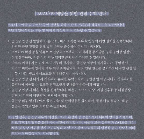 - 공연 영상, 사진, 녹음, 중계 등의 저작권 침해 행위를 금지하고 발견 시 강제 퇴장될 수 있습니다.