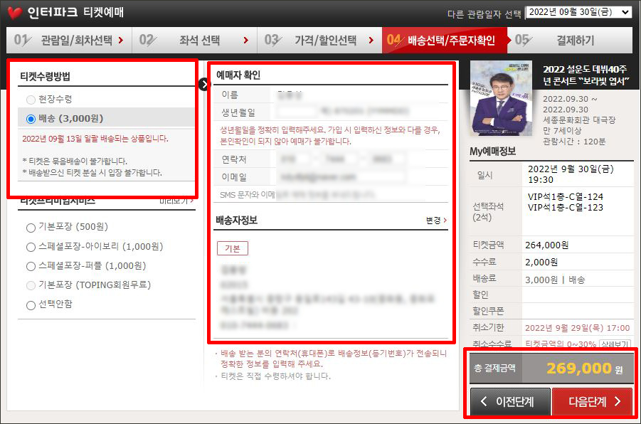 ⑤ 티켓 수령방법 선택 → 예매자 확인 → 배송자 정보 확인 → 다음 단계