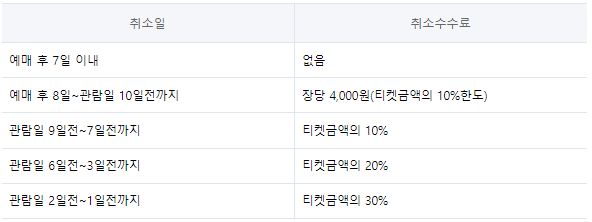 부득이한 사정으로 티켓 취소 시 취소수수료가 부과됩니다. 관람일을 기준으로 적용되니 아래를 꼭 확인하시길 바랍니다.