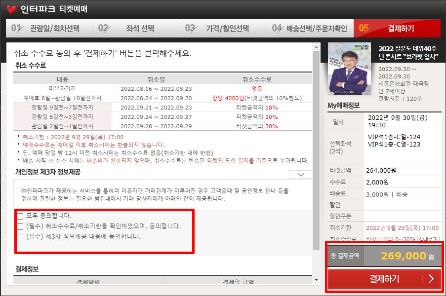 ⑦ 개인정보 정보제공 클릭 → 총 결제금액 확인 → 결제하기 완료