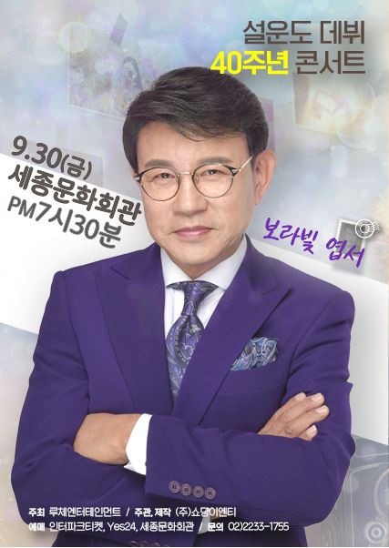 이번 40주년 콘서트는 설운도의 가수 인생 40년을 총망라한 무대를 펼쳐 보이고 누구도 예측 못한 "깜짝 게스트"가 무대를 선보인다고 밝히고 최근 화재가 된 "보랏빛 엽서"를 오리지널 보이스로 들을 수 있습니다. 트로트 황제가 전하는 흥과 감동의 무대, 설운도 40주년 콘서트 정보는 아래와 같습니다.