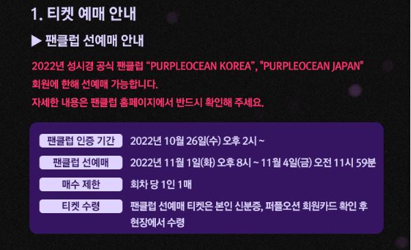 성시경의 팬클럽 퍼플오션 코리아 선예매와 일반 예매 정보는 다음과 같습니다.