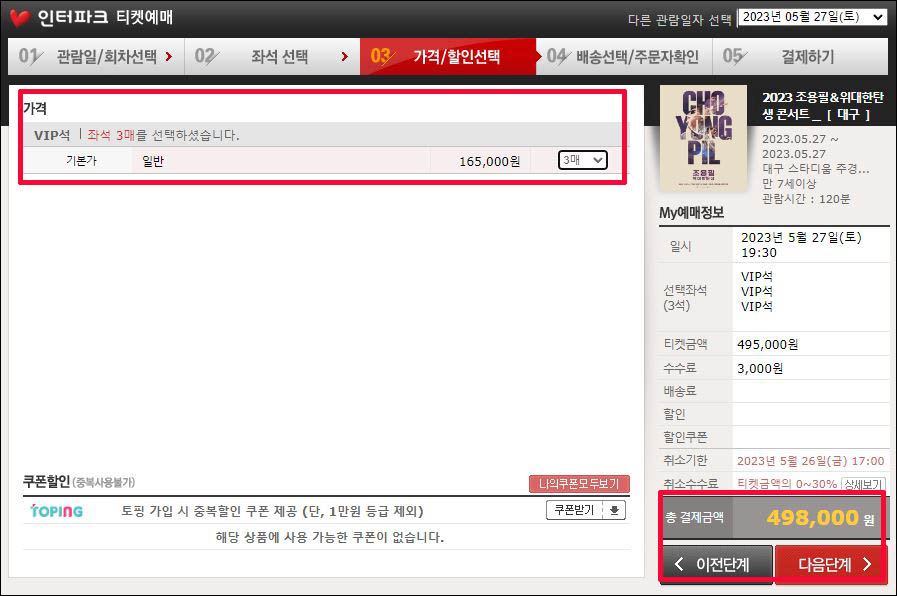 위와 같은 순서로 조용필 콘서트 예매가 가능합니다. 좌석이 빠르게 빠지고 있으니 서두르시길 바랍니다.