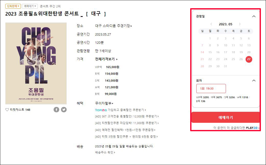 조용필 & 위대한 탄생 대구 콘서트는 현재 티켓 예매가 진행 중이다. 아래를 통해 예매가 가능하다.