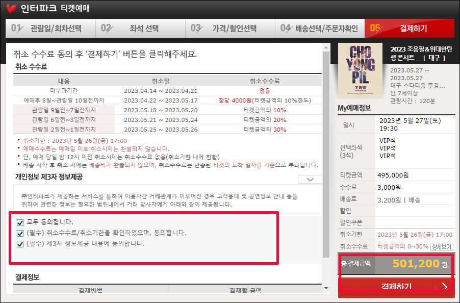 ⑧ 개인정보 제3자 정보제공 하단을 모두 체크한 후 결제하기 이동