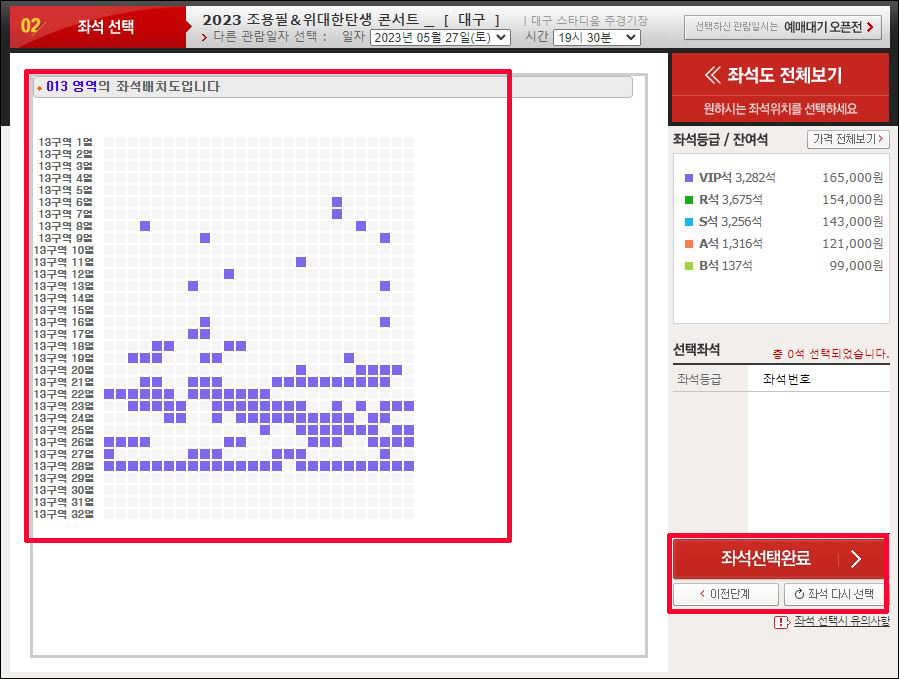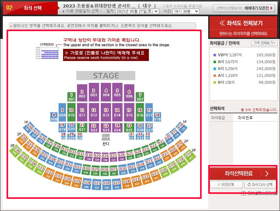 ③ 구역의 남은 좌석을 선택하시고 <좌석선택완료> 클릭