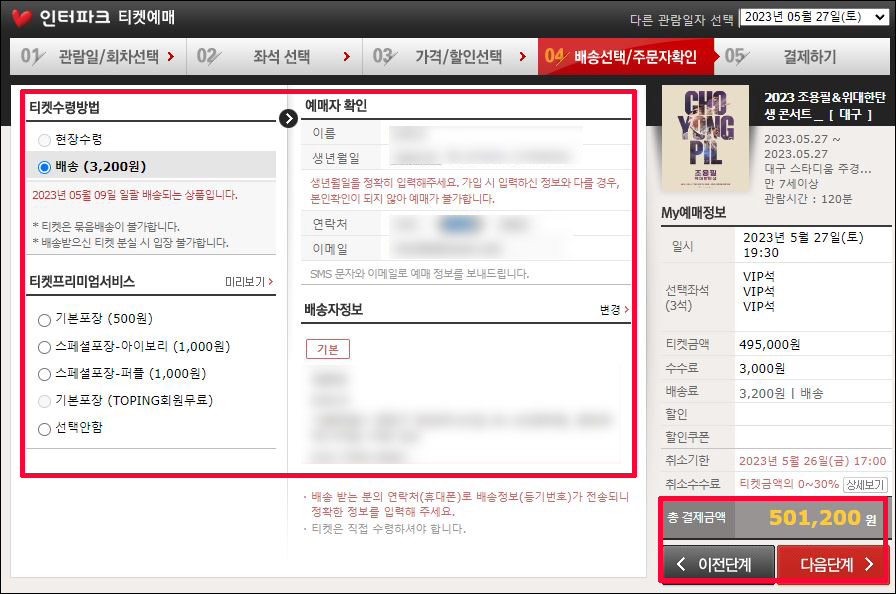 ⑤ 티켓수령방법을 선택 후 예매자 정보 확인 및 배송지 정보 확인 및 기입, 이후 다음 단계 클릭