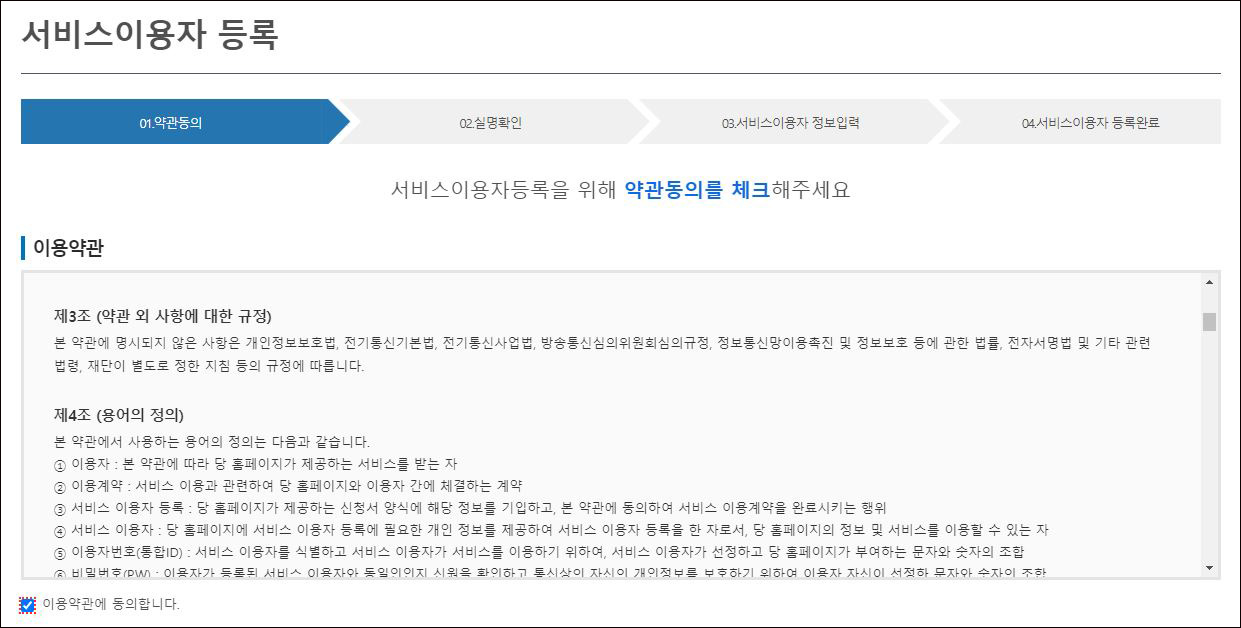③ 서비스 이용자 등록 과정은 약관동의 > 실명확인 > 서비스이용자 정보입력 > 서비스 이용자 등록완료 순으로 진행됩니다. 이후 등록은 마치시고 로그인을 하시면 됩니다.