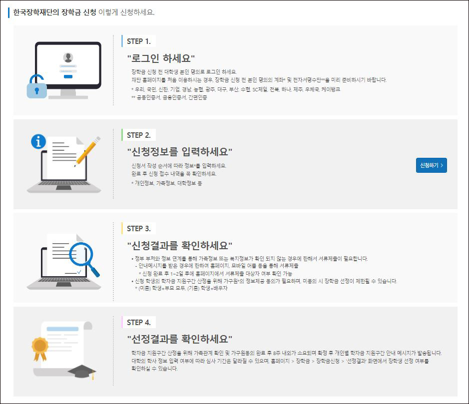 ④ 한국장학재단 신청 순서는 다음과 같습니다.