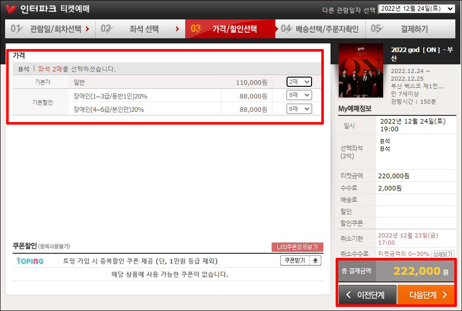⑤ 티켓 수령방법 선택 → 예매자 확인 및 정보 기입 → 배송자 정보 기입 → 다음 단계를 클릭