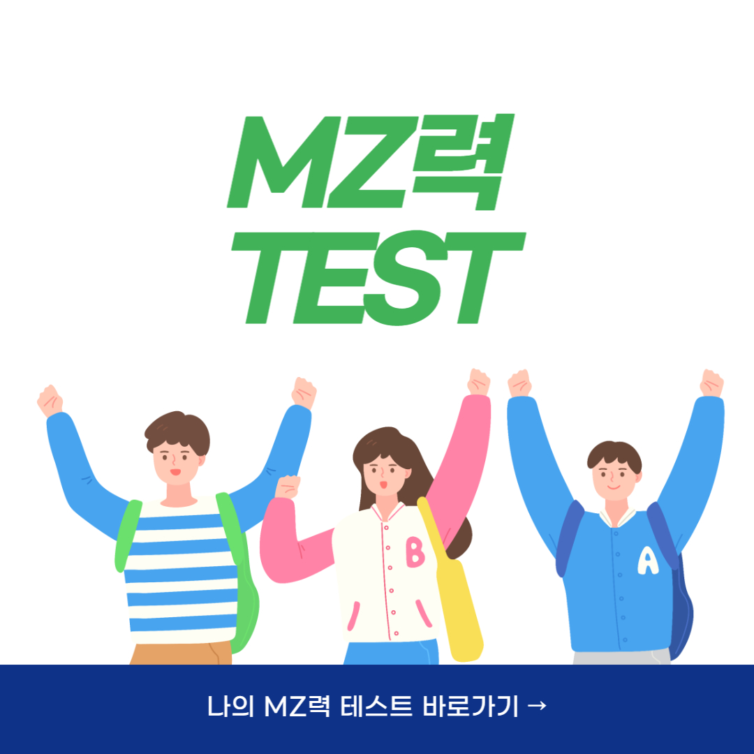 아래의 이미지를 클릭하시면 MZ력 테스트를 바로 시행할 수 있습니다. 총 20문항의 TEST를 받아보시길 바랍니다.