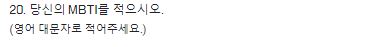 - 20번 문항은 자신의 MBTI를 적어주시면 됩니다. (MBTI를 알고 있는 것을 테스트)
